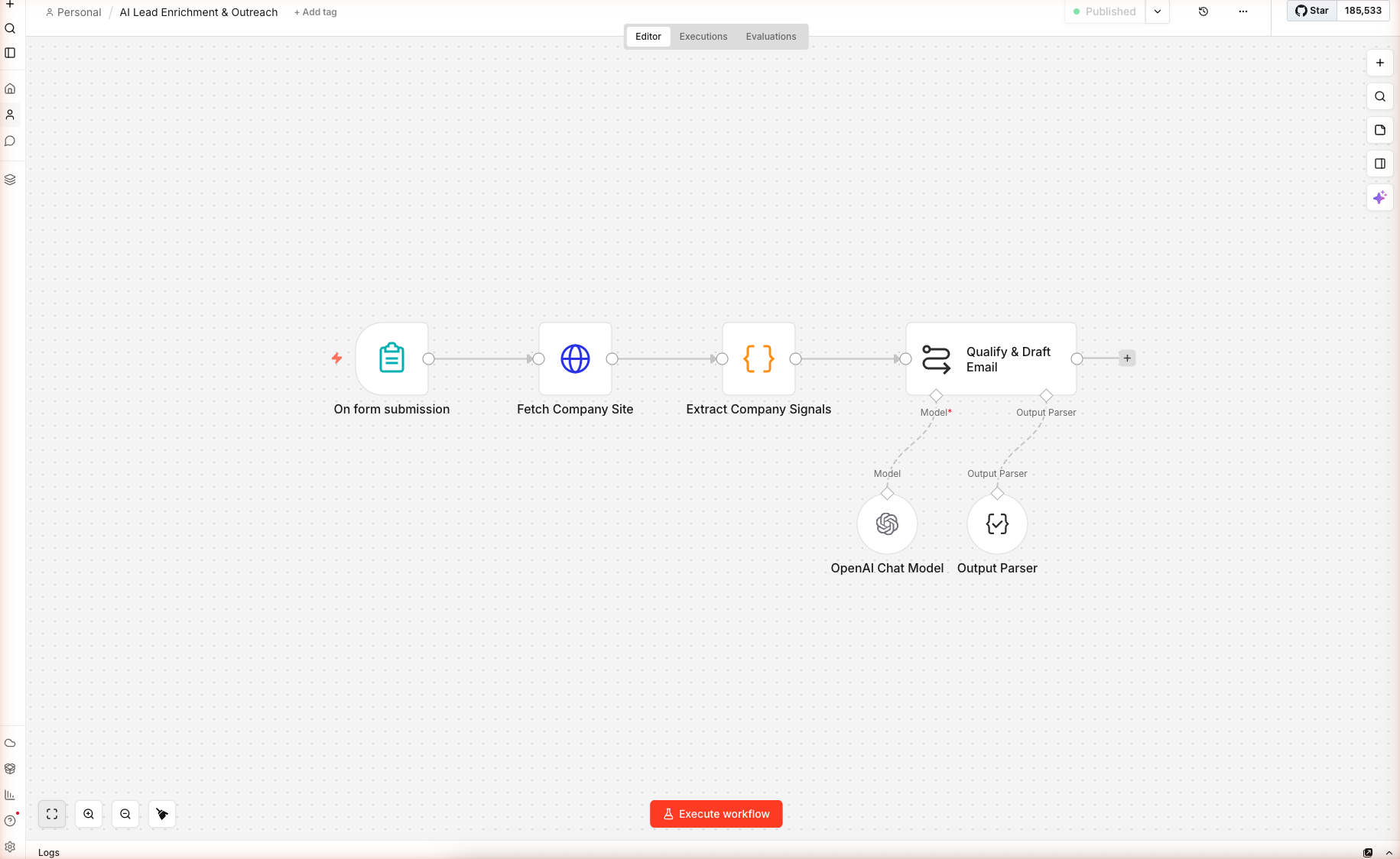From the home dashboard, click + Create workflow, click the blank canvas, paste the downloaded JSON. Six nodes load: On form submission → Fetch Company Site → Extract Company Signals → Qualify & Draft Email, plus OpenAI Chat Model and Output Parser as sub-nodes.