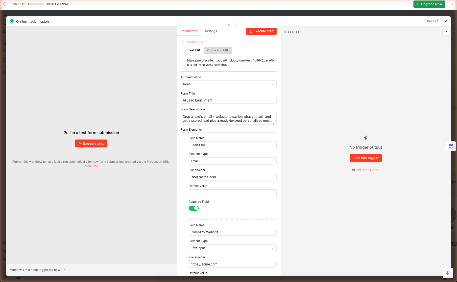 Click Test this trigger, open the form URL, and submit a real lead. A good first test: plug in a competitor's CEO (public info) as the lead, and your own company's value prop. The AI should score fit low because you're not a buyer for your own product.