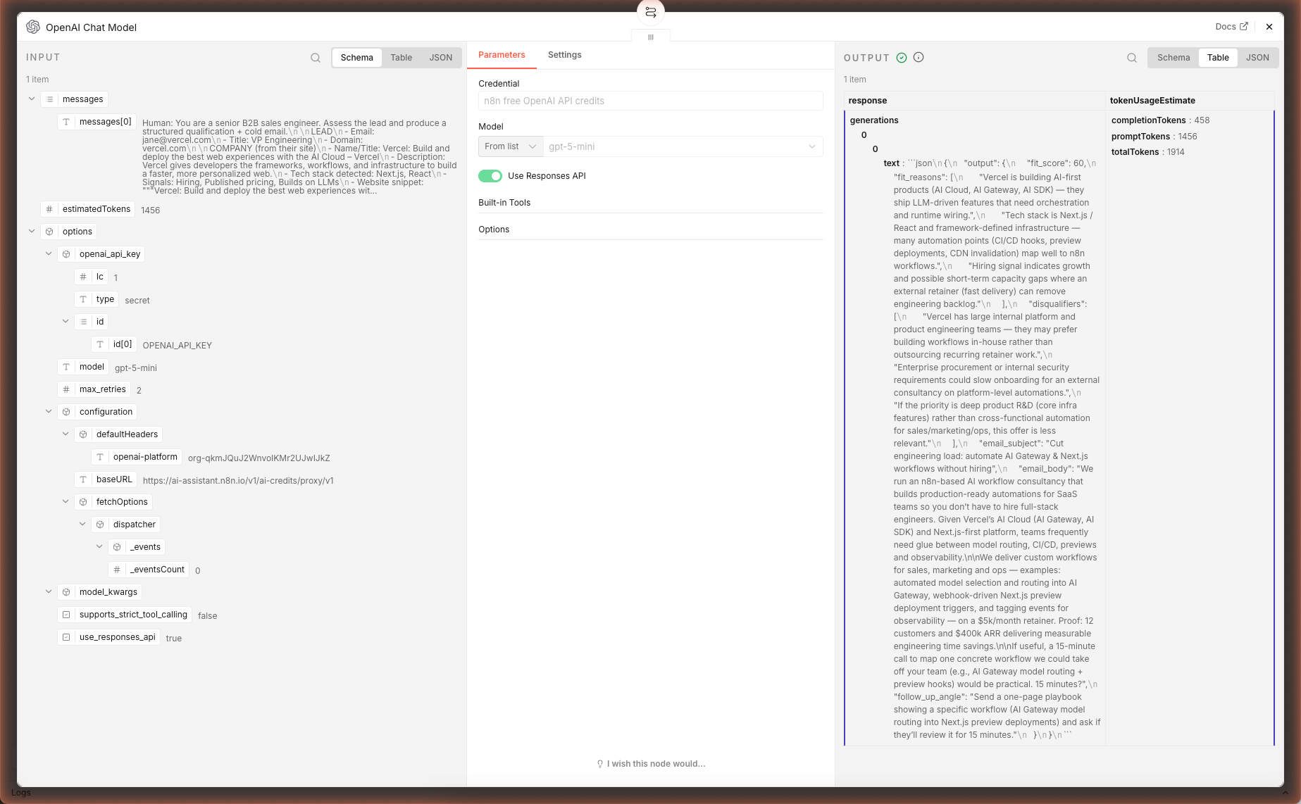 Open the OpenAI Chat Model sub-node and confirm gpt-5-mini at temperature 0.3 (low — consistency matters more than creativity for fit scoring).