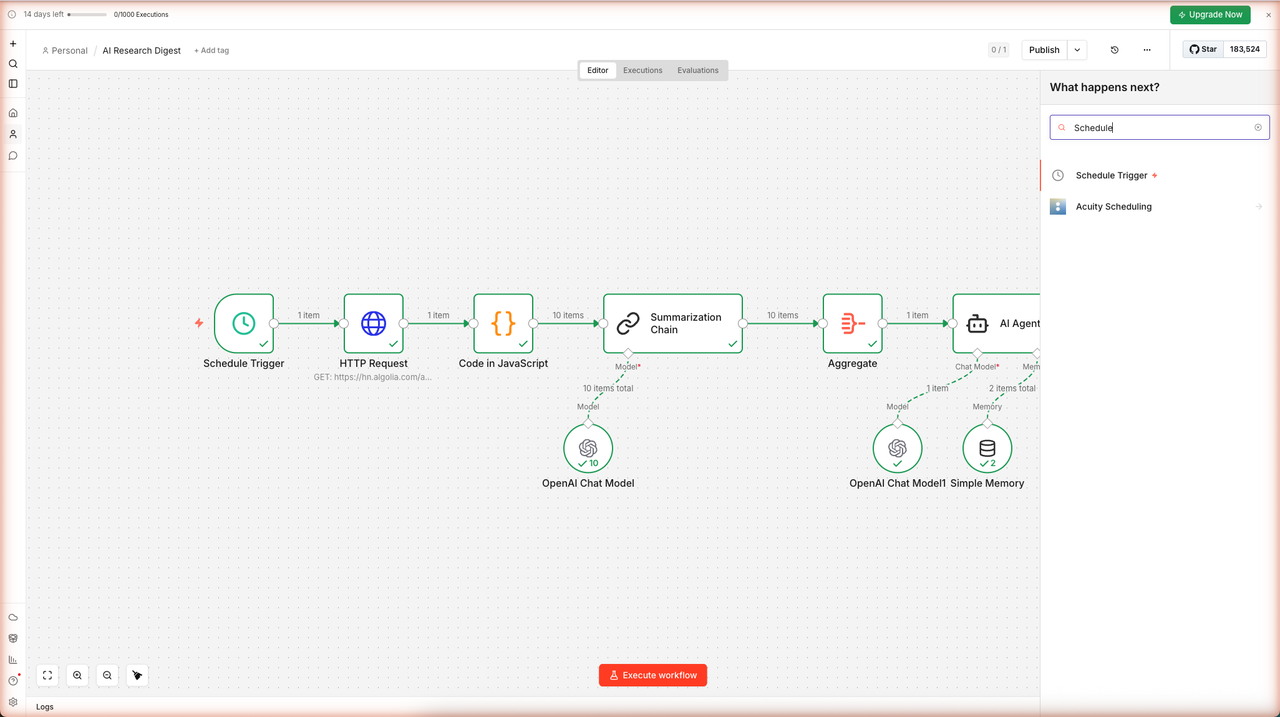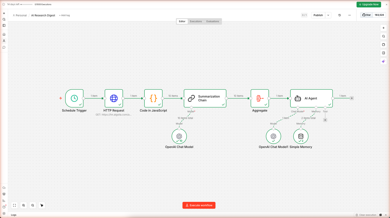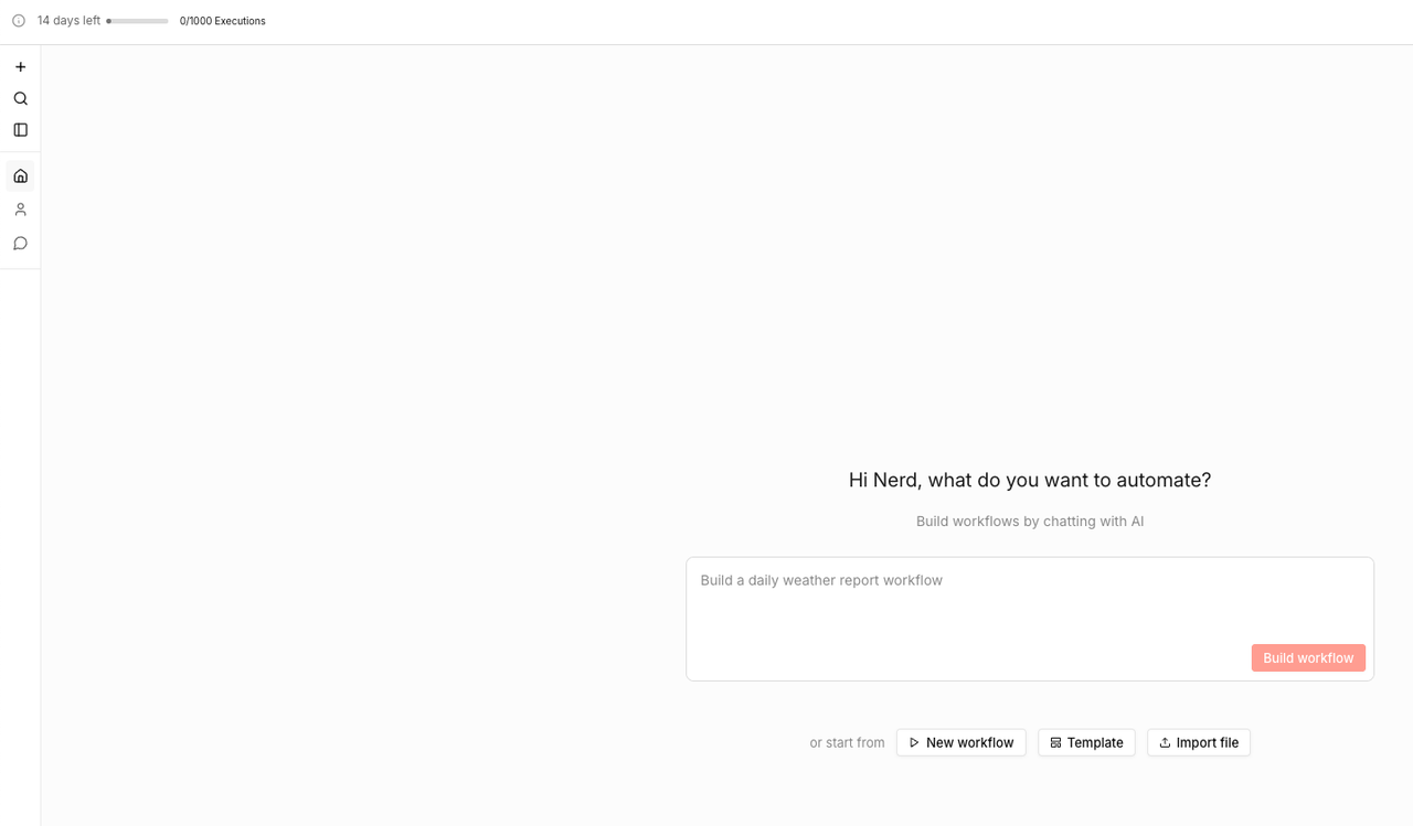 Note: The free trial gives you 14 days and 1,000 workflow executions. The free OpenAI credits are separate and do not expire with the trial.