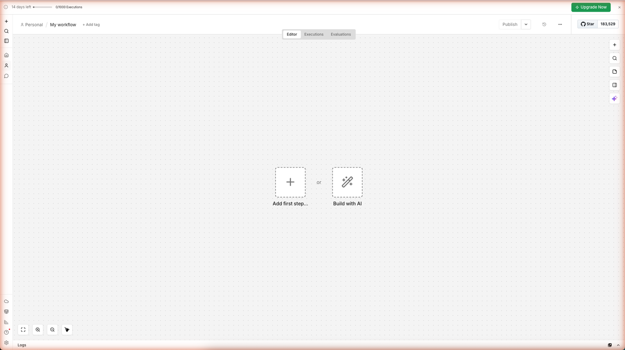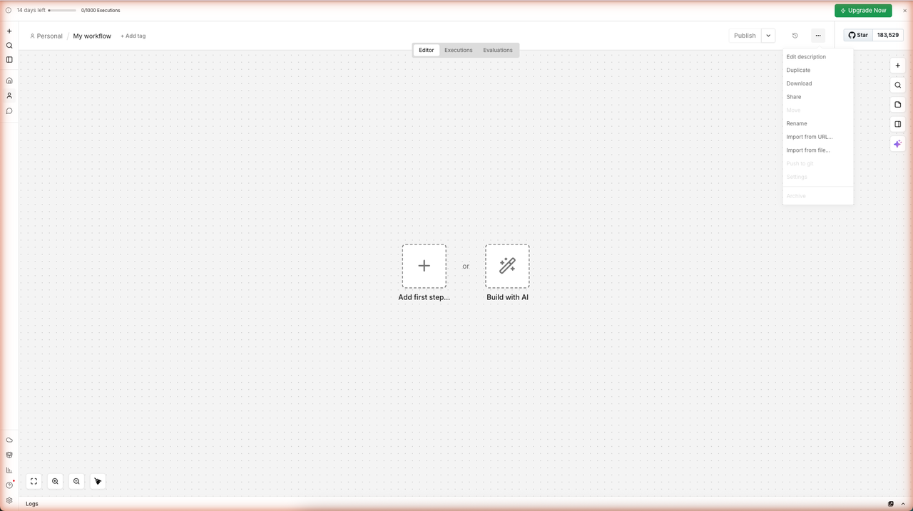 Click + Create workflow (or the New workflow button). n8n opens a blank canvas with two placeholders — Add first step… and Build with AI. This is your starting point.