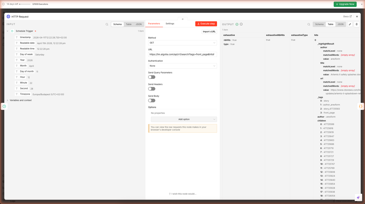 Click Execute step. n8n calls the API and returns the JSON response. You should see 1 item in the output — one object containing a hits array with the top 10 stories.