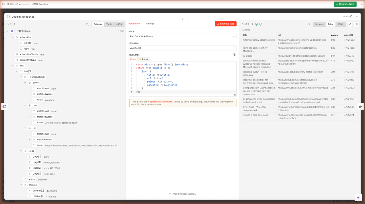This iterates over the hits array and returns 10 separate n8n items, each containing the story's title, URL, points score, and unique ID.