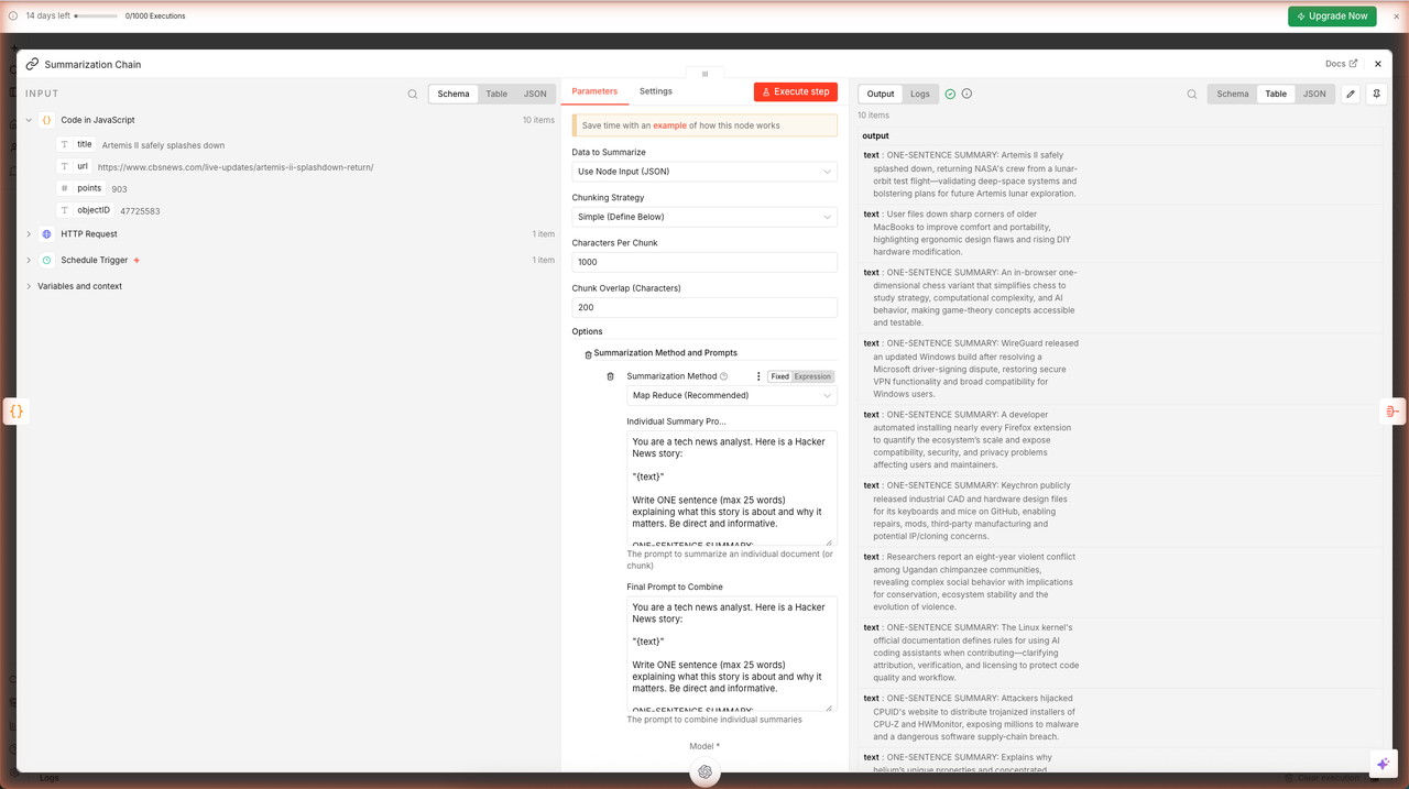 - Uses an AI Summarization Chain to write a one-sentence summary for each story