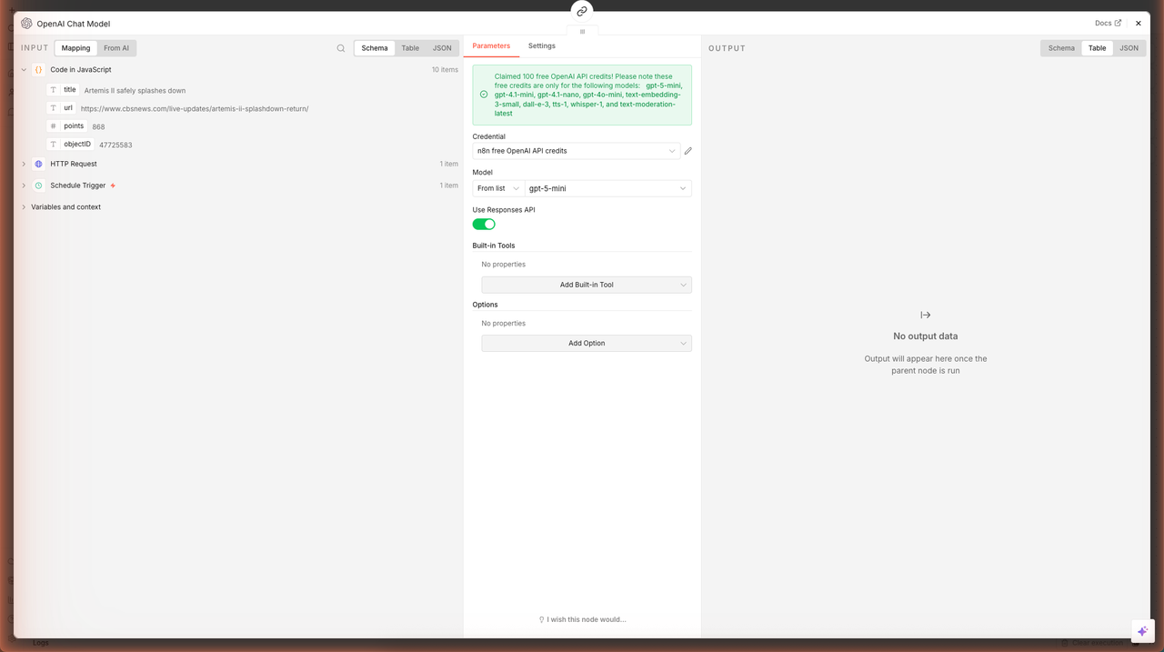 - Credential: select n8n free OpenAI API credits from the dropdown (this was created when you claimed the free credits earlier)