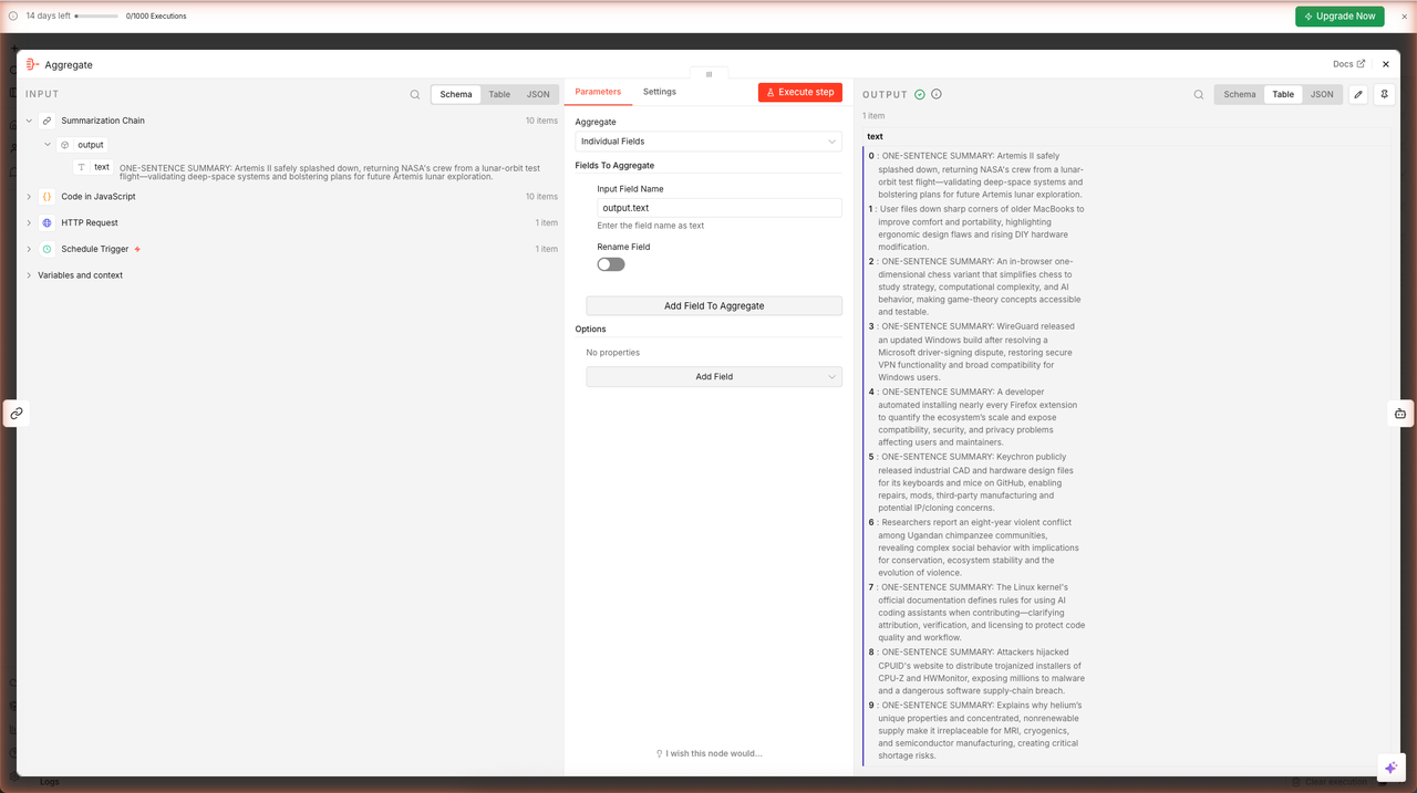 You have 10 items. The AI Agent needs a single item containing all summaries so it can write the complete digest in one pass. The Aggregate node collapses multiple items into one.