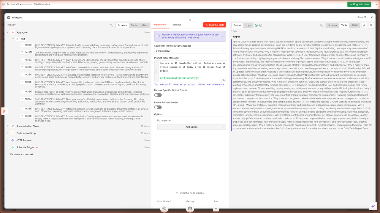 Click Execute step. The AI Agent runs — it loads memory (empty on first run), calls the LLM with your 10 summaries, and returns the formatted newsletter digest.