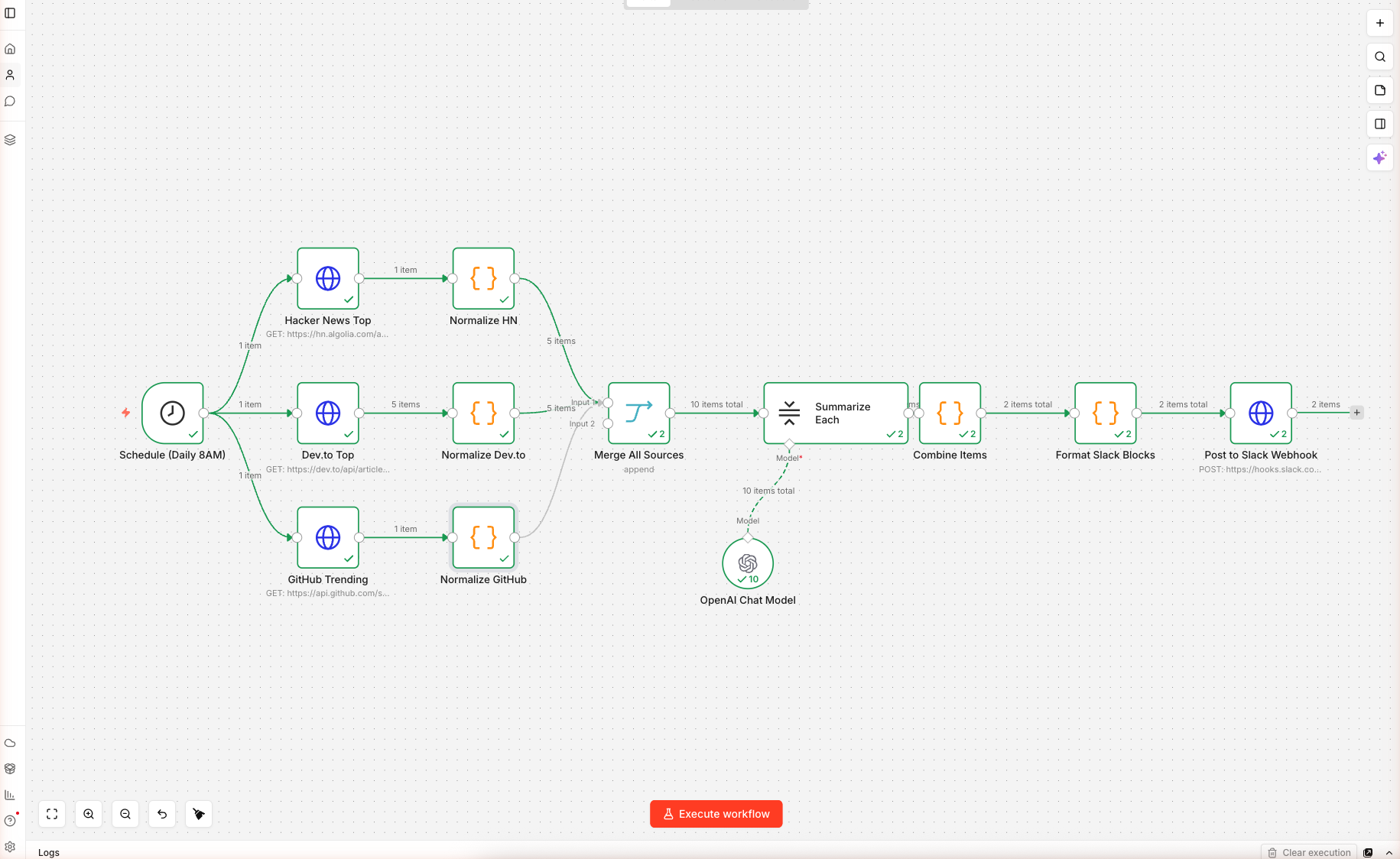 Click Execute workflow on the canvas. The workflow runs through all 12 nodes and posts to your Slack channel. If everything's right, you get a rich message that looks like a curated newsletter — sources separated, links clickable, AI summaries under each item.