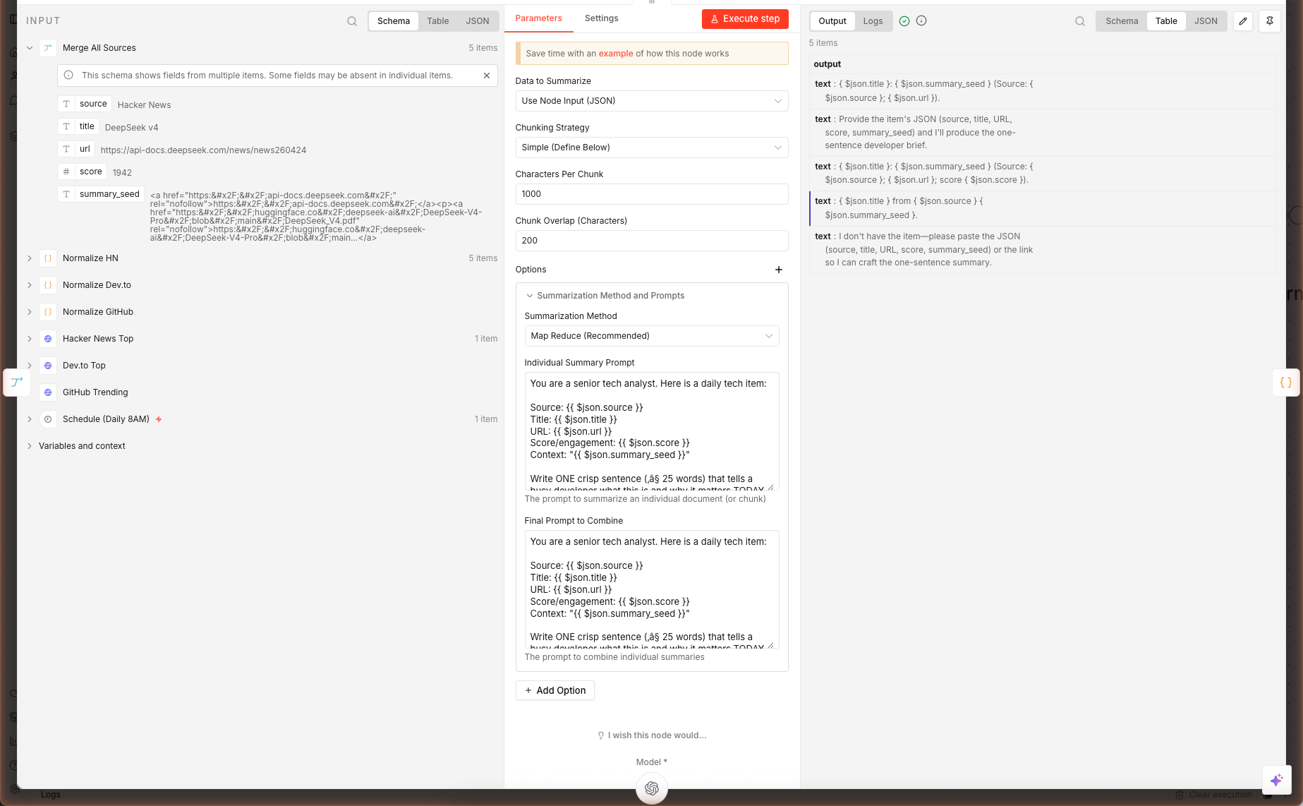Above: the Summarize Each node opened after a real execution — left panel is the merged input from all three sources, right panel is the gpt-5-mini one-sentence summaries the chain produced.